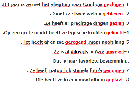 1-Dit jaar is ze met het vliegtuig naar Camboja gevlogen. 1-هذا العام لازم الذهاب الي كمبوديا بالطائرة. 2- Daar is ze twee weken gebleven. 2- مكثت هناك لمدة أسبوعين. 3-Ze heeft er prachtige dingen gezien. 3-رأت أشياء جميلة. 4-Op een grote markt heeft ze typische kruiden gekocht. 4-في سوق كبير قامت بشراء أعشاب نموذجية. 5-Het […]