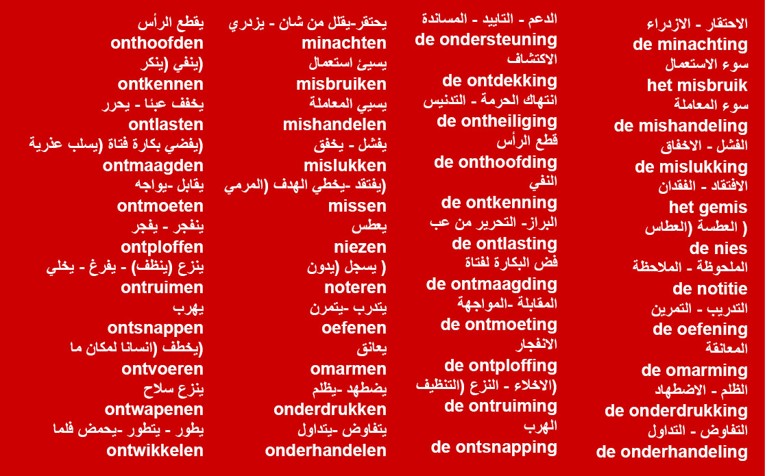 [error][/error] هذا الدرس ضمن سلسلة دروس كلمات هولندية التي يقدمها موقع “Nederlands Leren” بشكل مجاني لكل من يرغب بتعلم اللغة الهولندية. نطرح عليكم جمل هولندية  ما يقابلها باللغة العربي . ننصحكم بمتابعة هذا الدرس وفهم كل معانيه والاستفادة منه في زيادة رصيد الكلمات الهولندية لديكم .      -المعني -الاسم القائم بذاته (z.n.w) الحال / […]